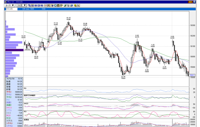 日経225mini 3月限 2016年2月5日 下降相場パターン 後場急騰あり