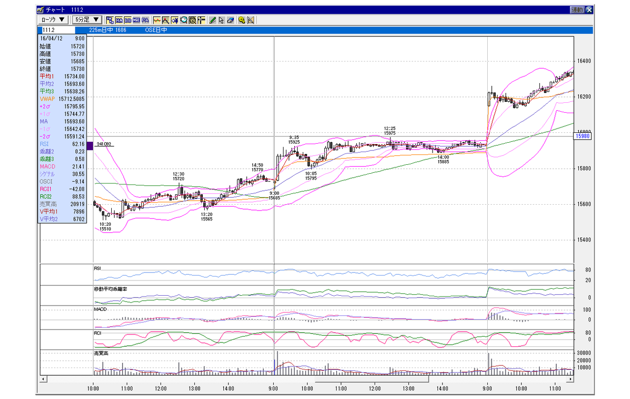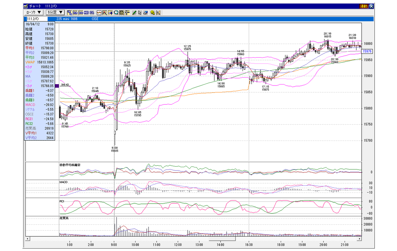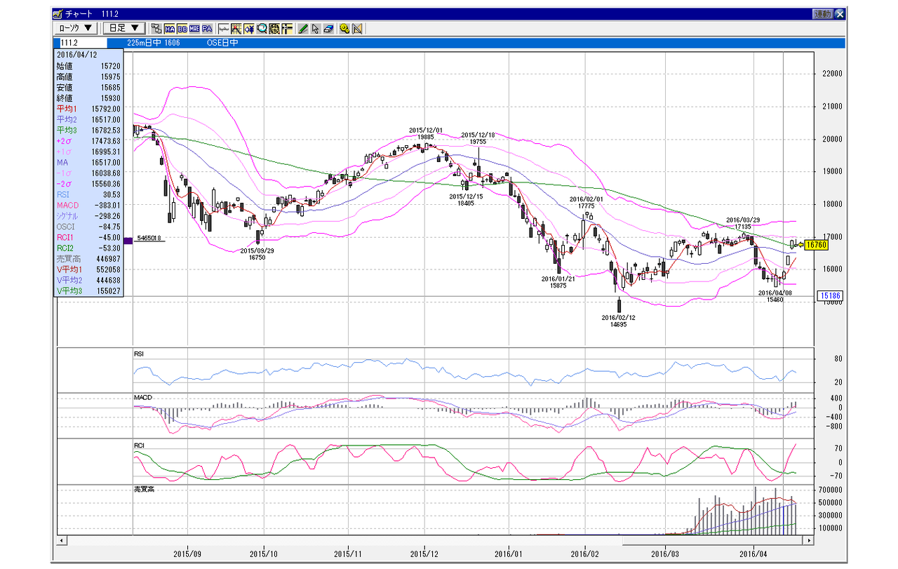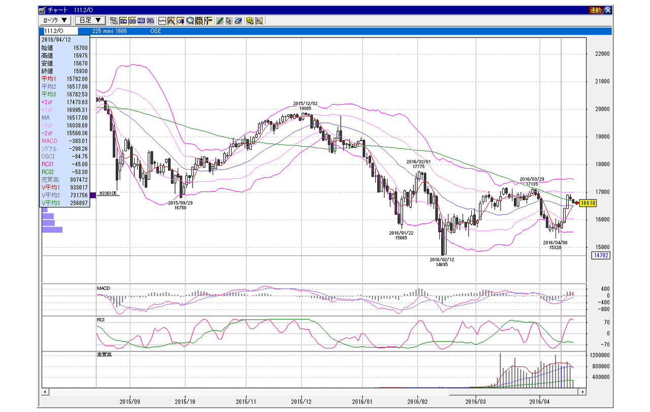 日経225mini 6月限 2016年4月12日 小幅GD、上昇パターン(100円以下前後GD) 2016年4月12日 balenouser 未分類 この日体調が悪くまともにトレードが出来なかったが、この日の買いが火付けとなった前夜のセッションの開始後も為替の上げとともに勢いついた。 SQが終わってから政府系が一気に買いを入れてきた。こういう時はその流れが止まるまで徹底的に買い。