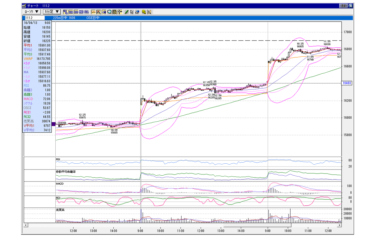 日経225mini 6月限 2016年4月13日 小幅GU、上昇パターン(100円以下前後GU)