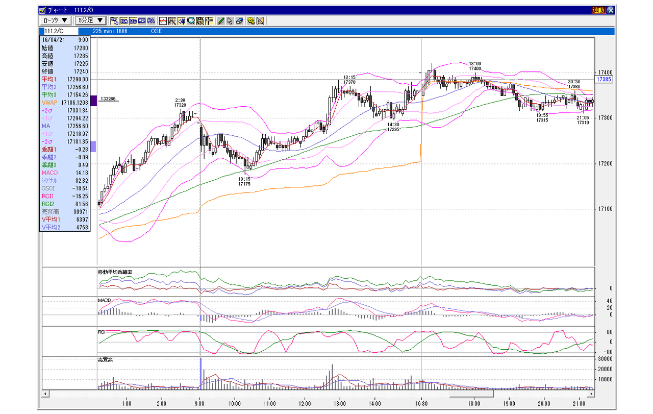 日経225mini 6月限 2016年4月21日 小幅GD、上昇パターン(100円以下前後GD)