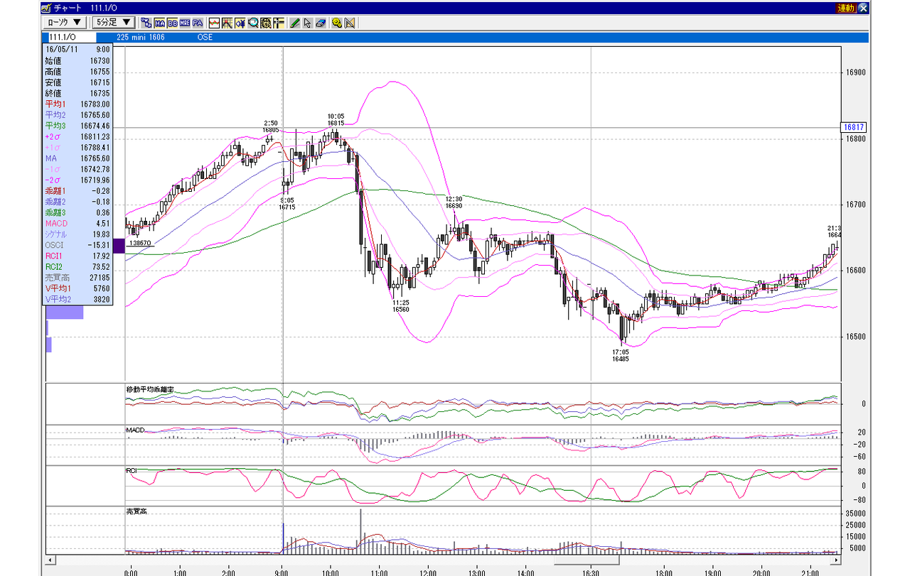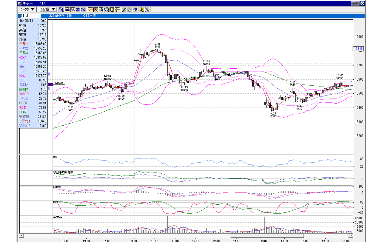 金曜日の寄り寸前に一気に板が噴きあがり、前夜の高値付近まで上がり(5分足BBの上限)寄り付く。そこから