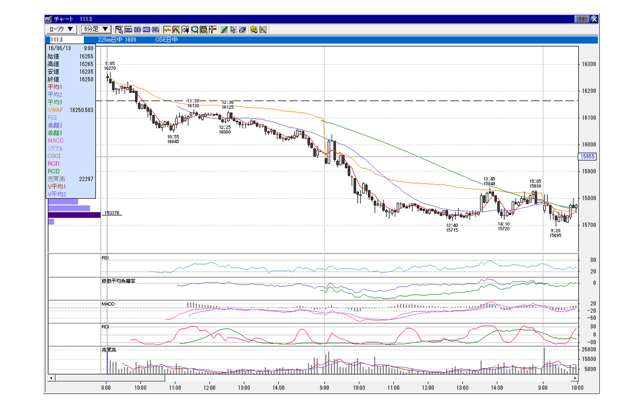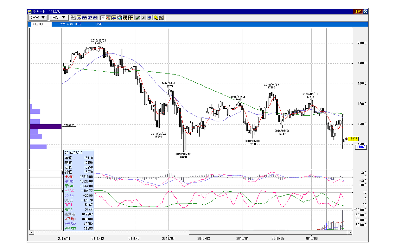 日経225mini 9月限 2016年6月13日 小幅GD、下昇パターン(100円以下前後GD)