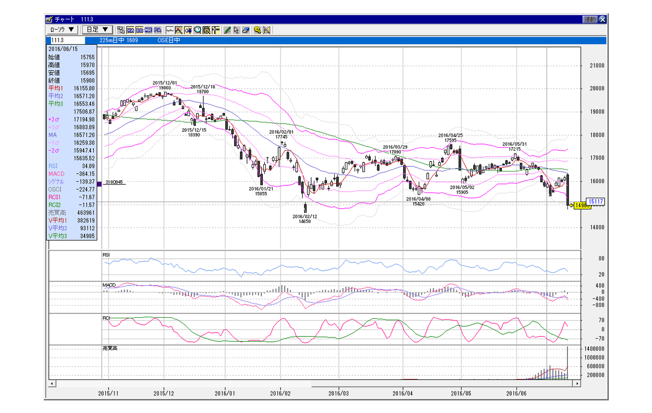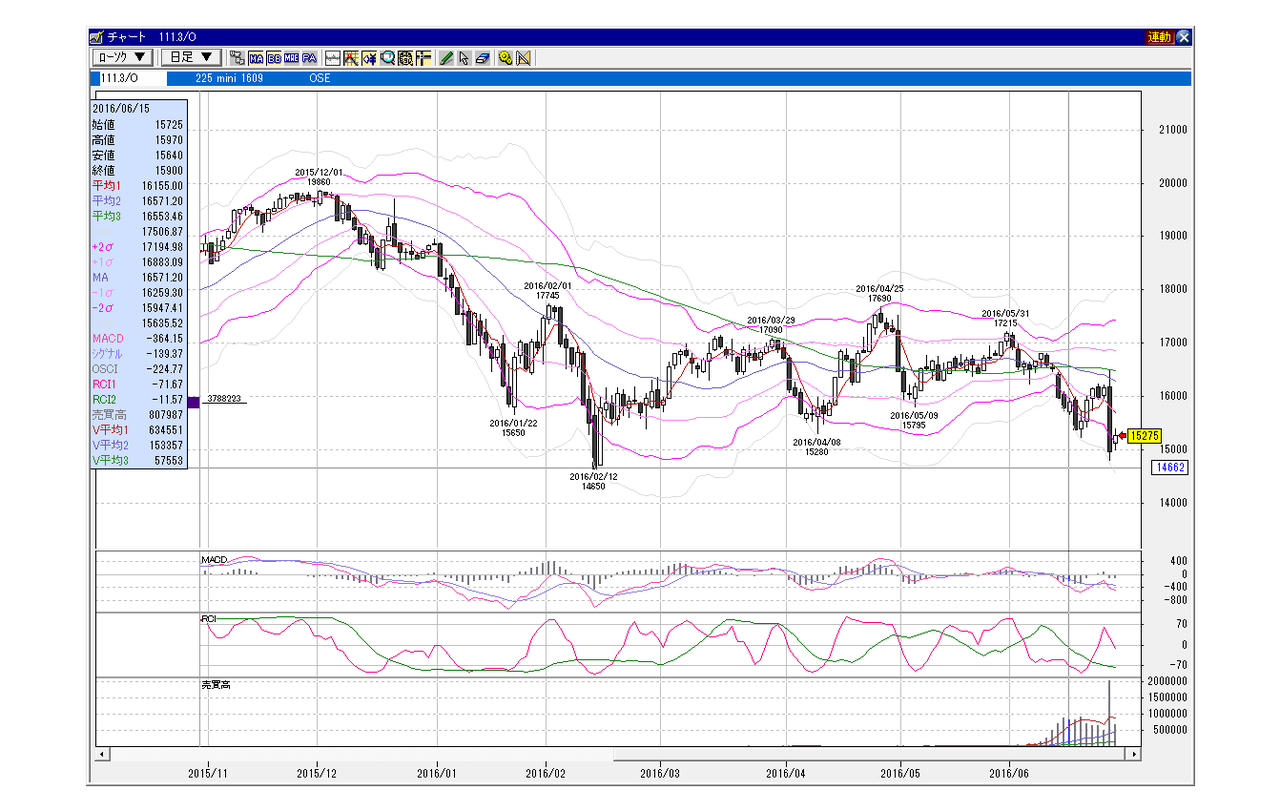 日経225mini 9月限 2016年6月15日 小幅GU、上昇パターン(100円以下前後GU)