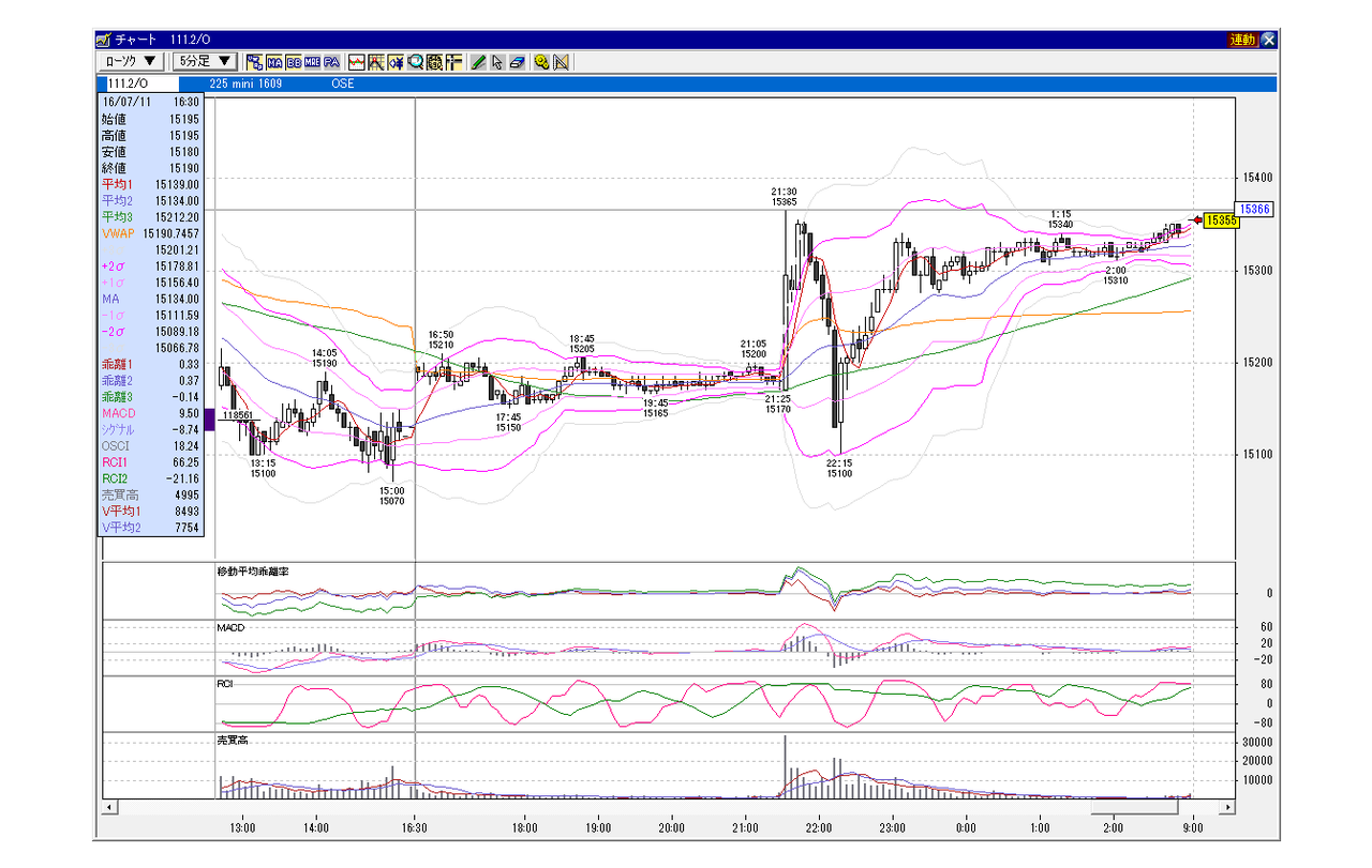日経225mini 9月限 2016年7月8日 夜間 米国雇用統計発表時 イベント絡み 2016年7月8日 balenouser 未分類 今月はSQ日と雇用統計の日が同日となった。先月の雇用統計は3.8万人と言う最悪の数字が出たが今回は予想を10数万人以上回る28万人と言う数字で一気に上昇。さすがに為替が数円上がるほどではなかったが、為替が再び(英国離脱時以降)100円を割ったのをきっかけに底打ちとなり、上昇してしっかりとした動きとなった。