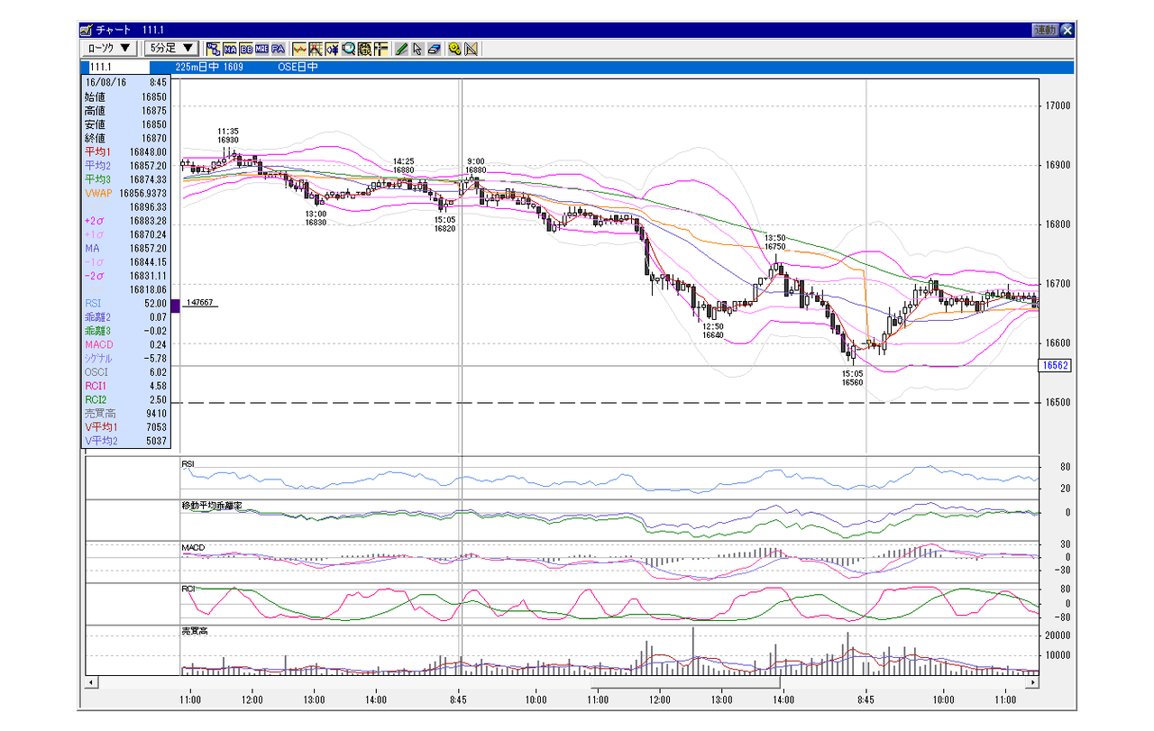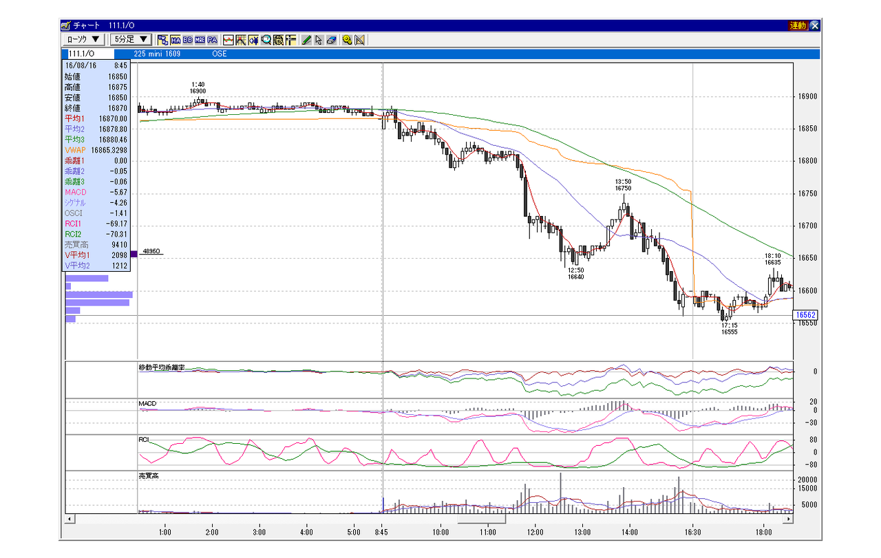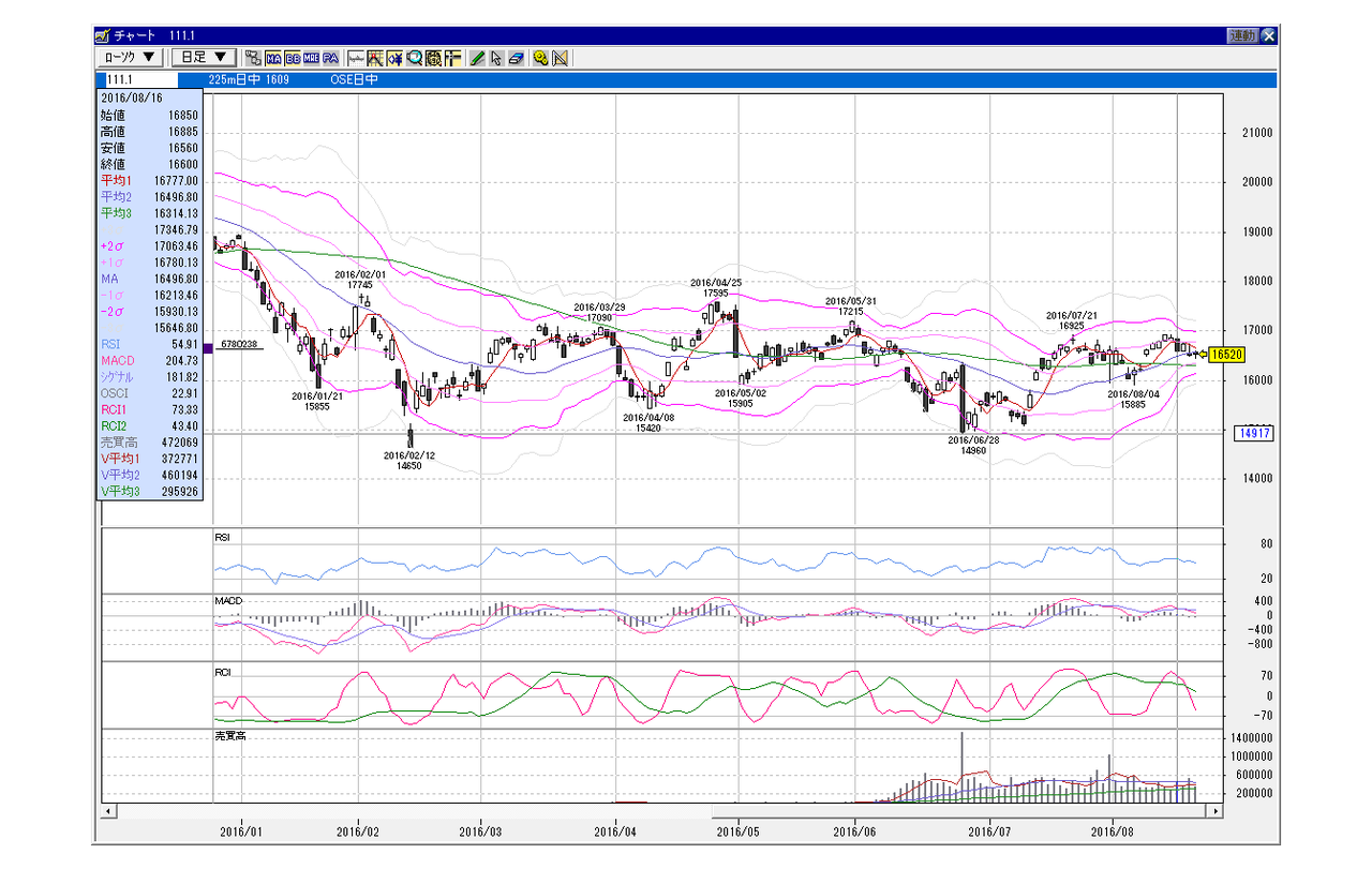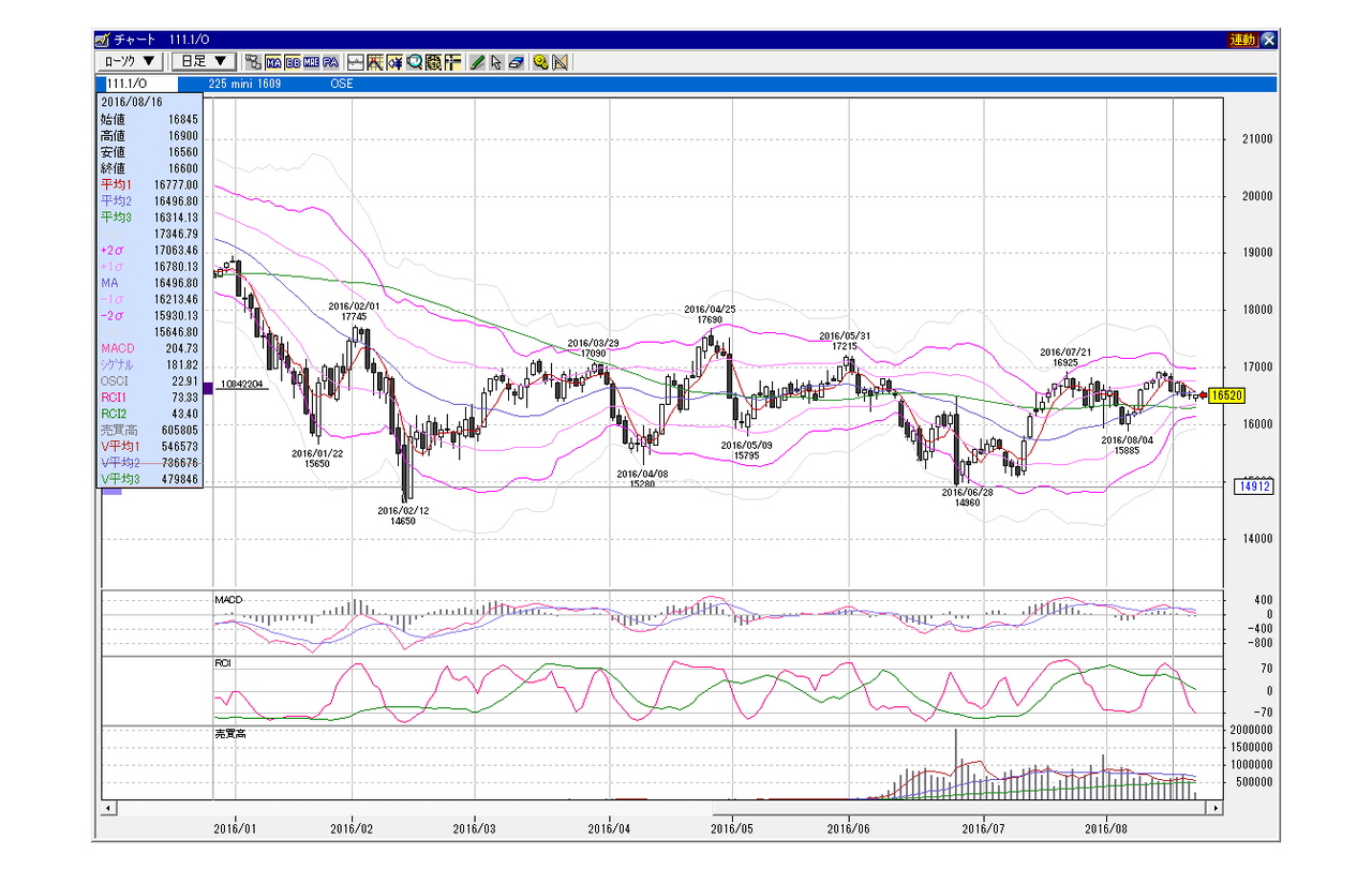 日経225mini 9月限 2016年8月16日 小幅GD、下昇パターン(100円以下前後GD)