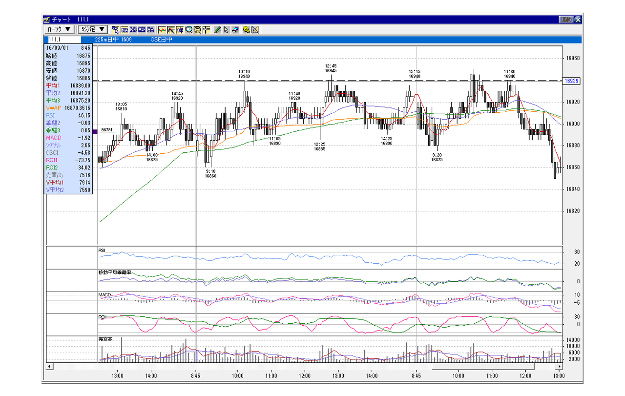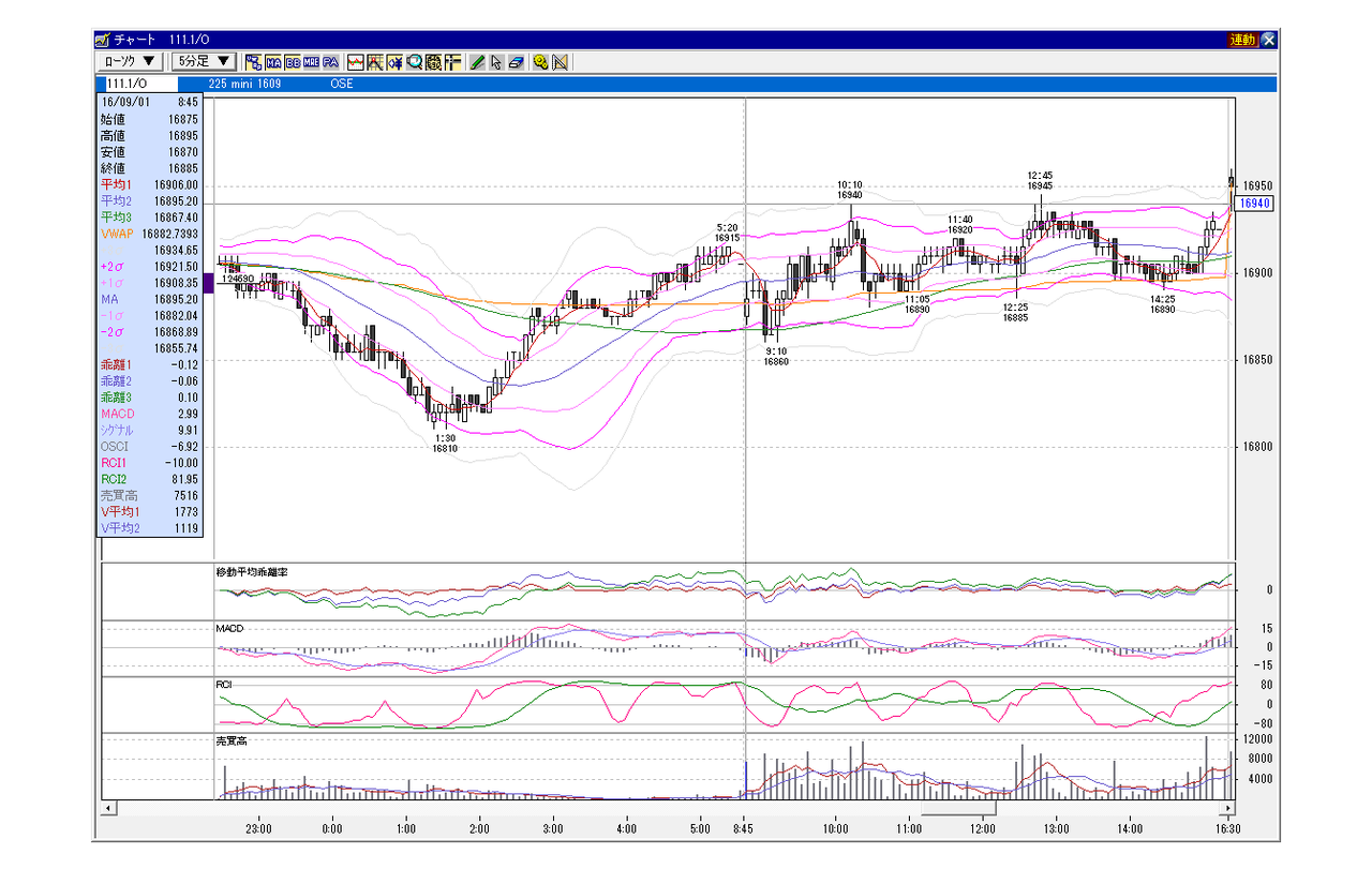 日経225mini 9月限 2016年9月1日 小幅GD、上昇パターン(100円以下前後GD) 上下レンジ