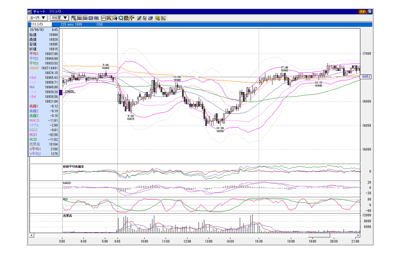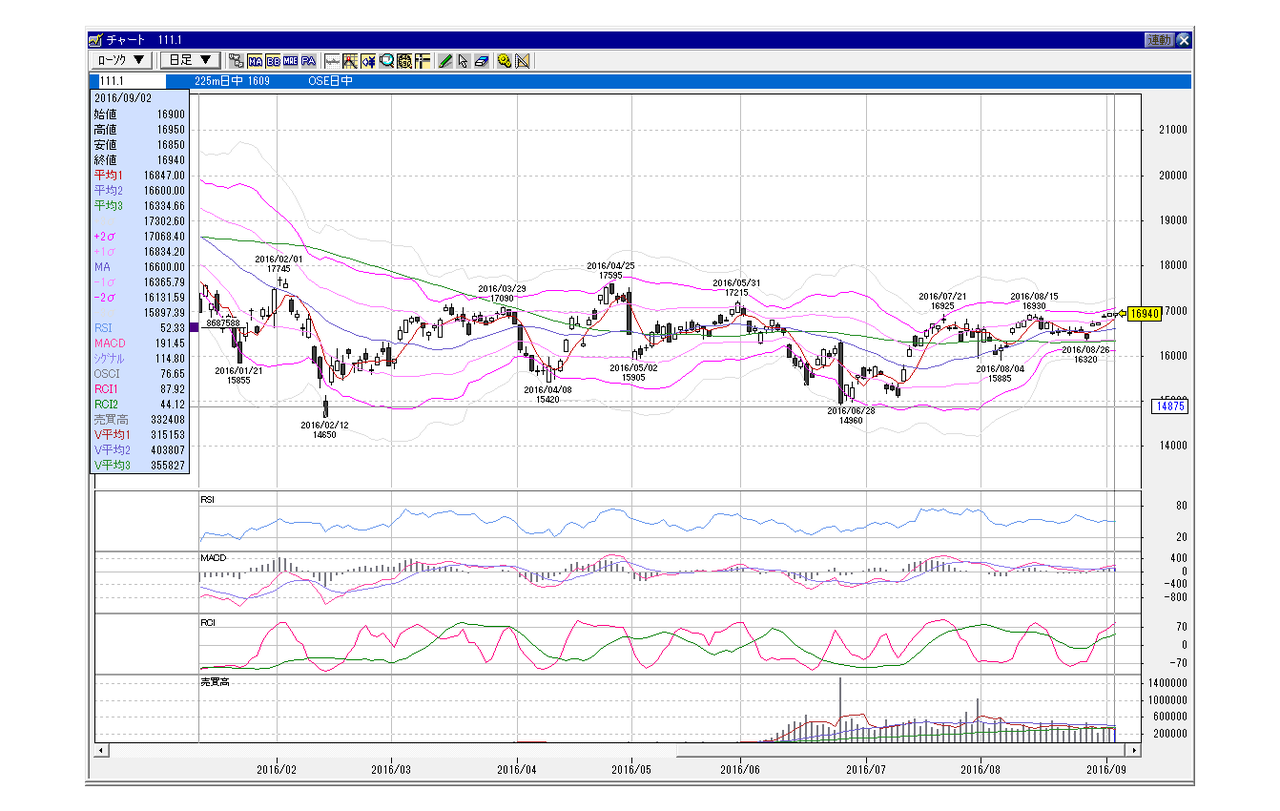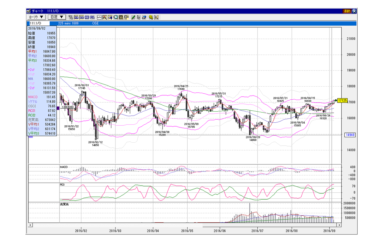 日経225mini 9月限 2016年9月2日 小幅GD、上昇パターン(100円以下前後GD) 上下レンジ