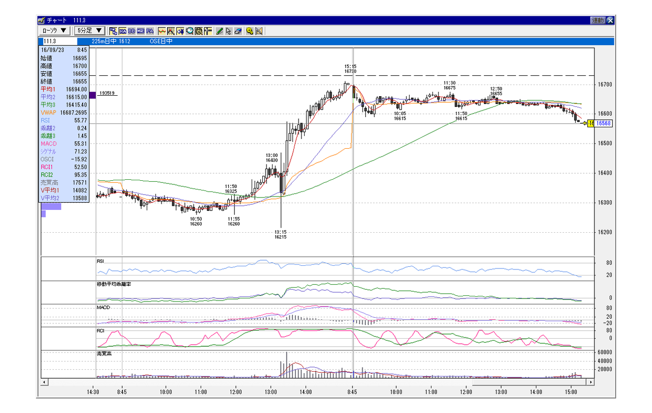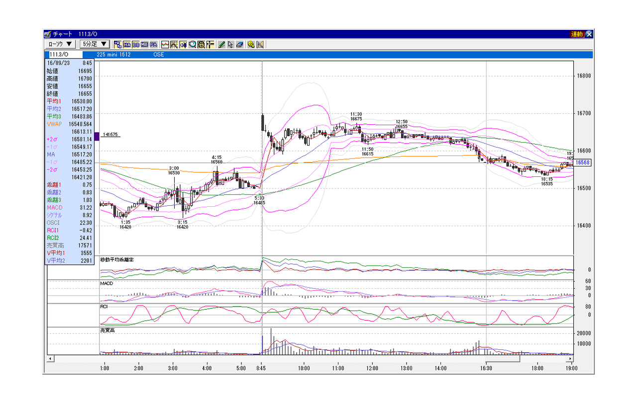 日経225mini 12月限 2016年9月23日 GD、下降パターン(200円以下前後GU)