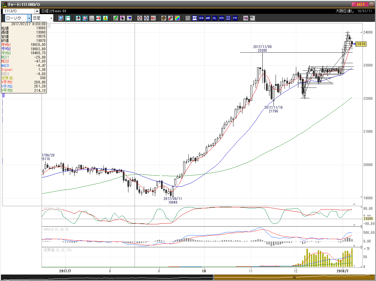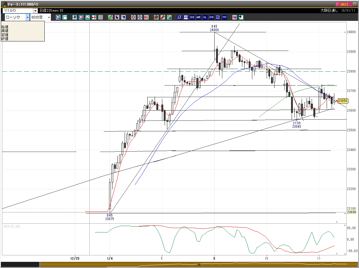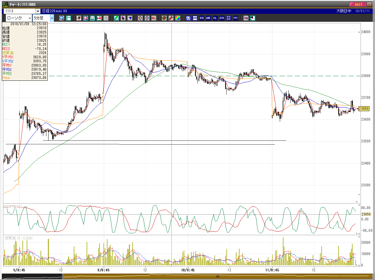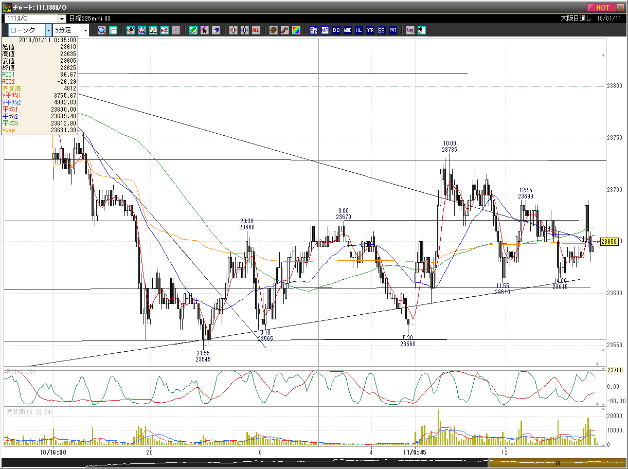 前夜の下げの後、レンジの中心でスタート。昨晩200円ほど下げたが、日足の窓も埋めておらず、SQ週の動きとしても中途半端なため更に下に行くと読み、23605円で売りでエントリー。(5分足5本目)