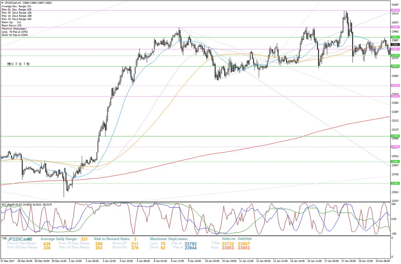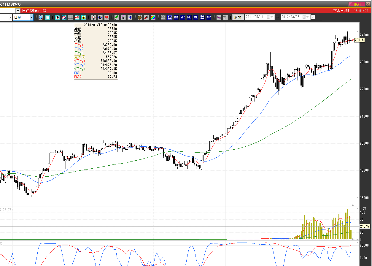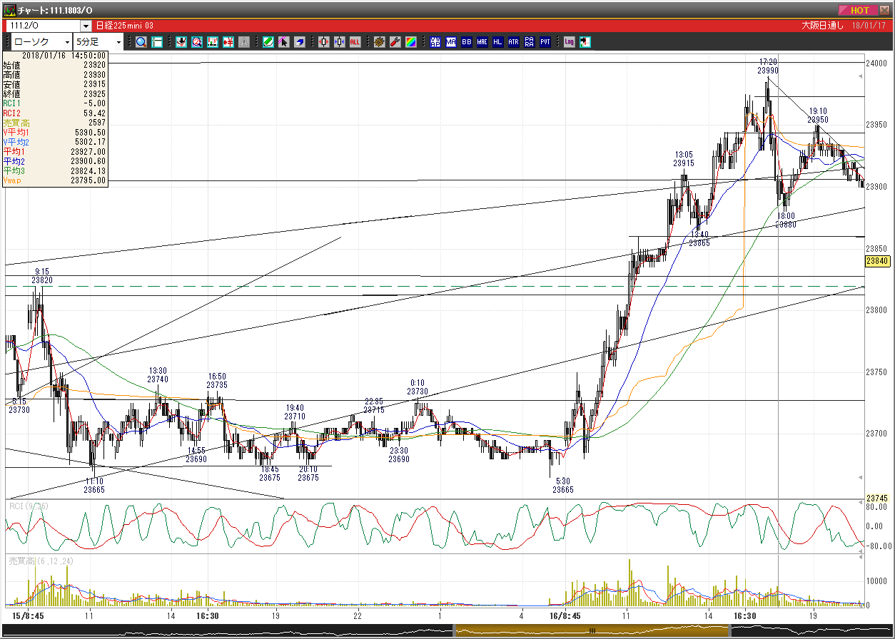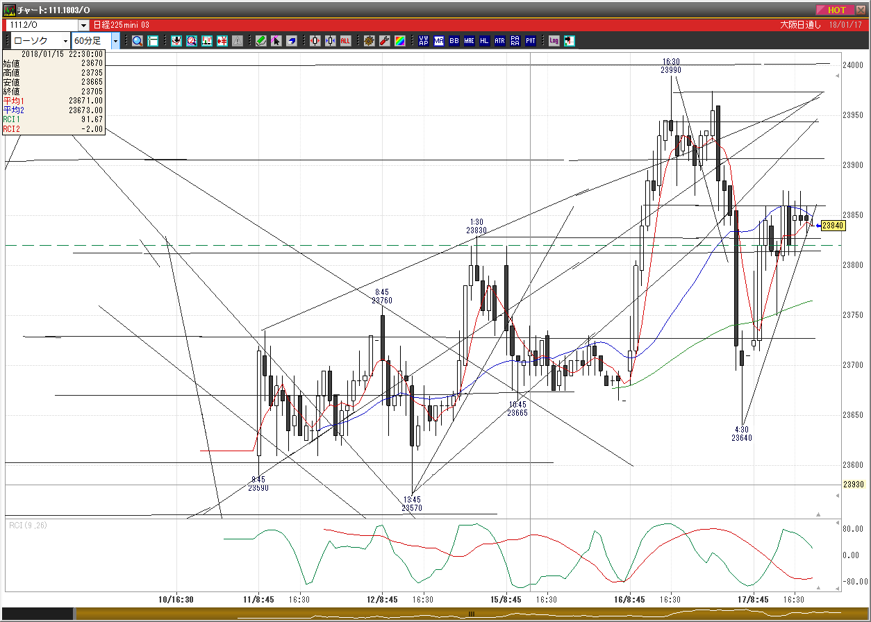 2018/1/16 日経225先物 日中チャート/ 2018年3月限 2018年1月16日 balenouser 未分類 相変わらずの高値圏でのレンジ相場。日中によくある上昇パターンがこの日に出る。(トレード環境にいなかったので残念ながら見送り)寄り付き後にレンジブレイク後に押し目を作って一気に上昇。 日中引けベースで200円以上の上昇幅。(夜間に23900円で抑え込まれ夜中に下落)海外先物のMT4チャートだと同じようなパターンでレンジ形成しているのがよくわかる。 5分足 1時間足 日足 海外先物チャート1時間足(MT4) 緑のチェックがブレイクした時点