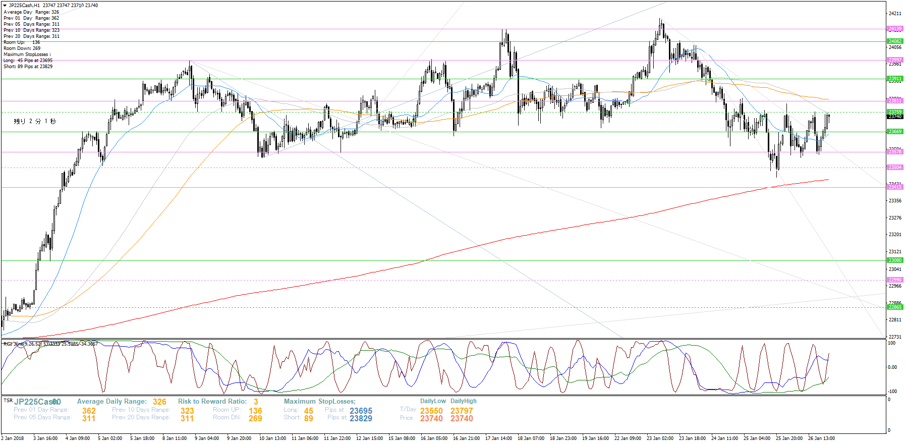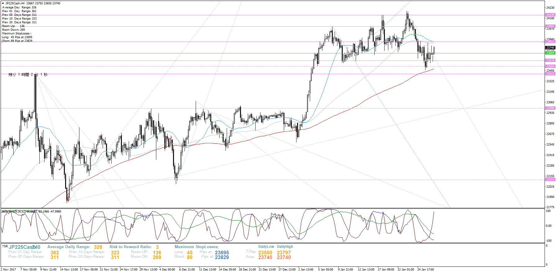 2018/1/22~23 日経225先物 夜間~日中チャート:日銀金融政策発表/ 2018年3月限 2018年1月23日 balenouser 未分類 日銀政策発表の前夜から東京は大雪になったが、相場はNY市場スタート後にレンジブレイクして、そのまま翌日寄り付きまで買いが続く展開に。寄り付き後も高値更新→押し目を付け一気に24100円まで上昇。 5分足 12時過ぎに金融政策が発表され(内容は現状維持)一気に75MAまで下落して、その後再び上昇して引けまで買い続けられ、直近高値24125円を抜けた。非常に荒い動きとなたが大口の損益分岐点を超えてることもありかなり恣意的な上げに感じた相場だった。(それはその後のナイトセッションからの下げで分かる) 1時間足。グリーンのチェックマークがブレイクしたポイント。綺麗にブレイクしているのがわかる。 4時間足 日足(画像は1月26日終了時点)