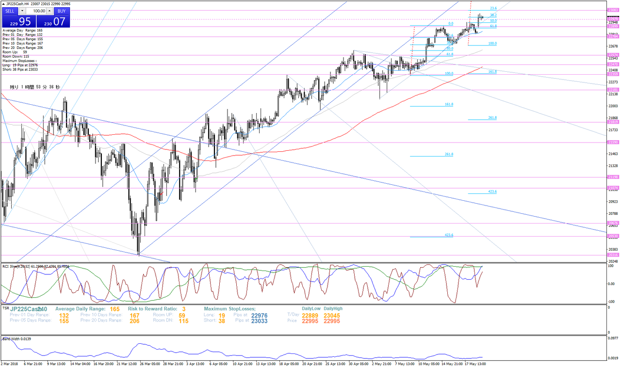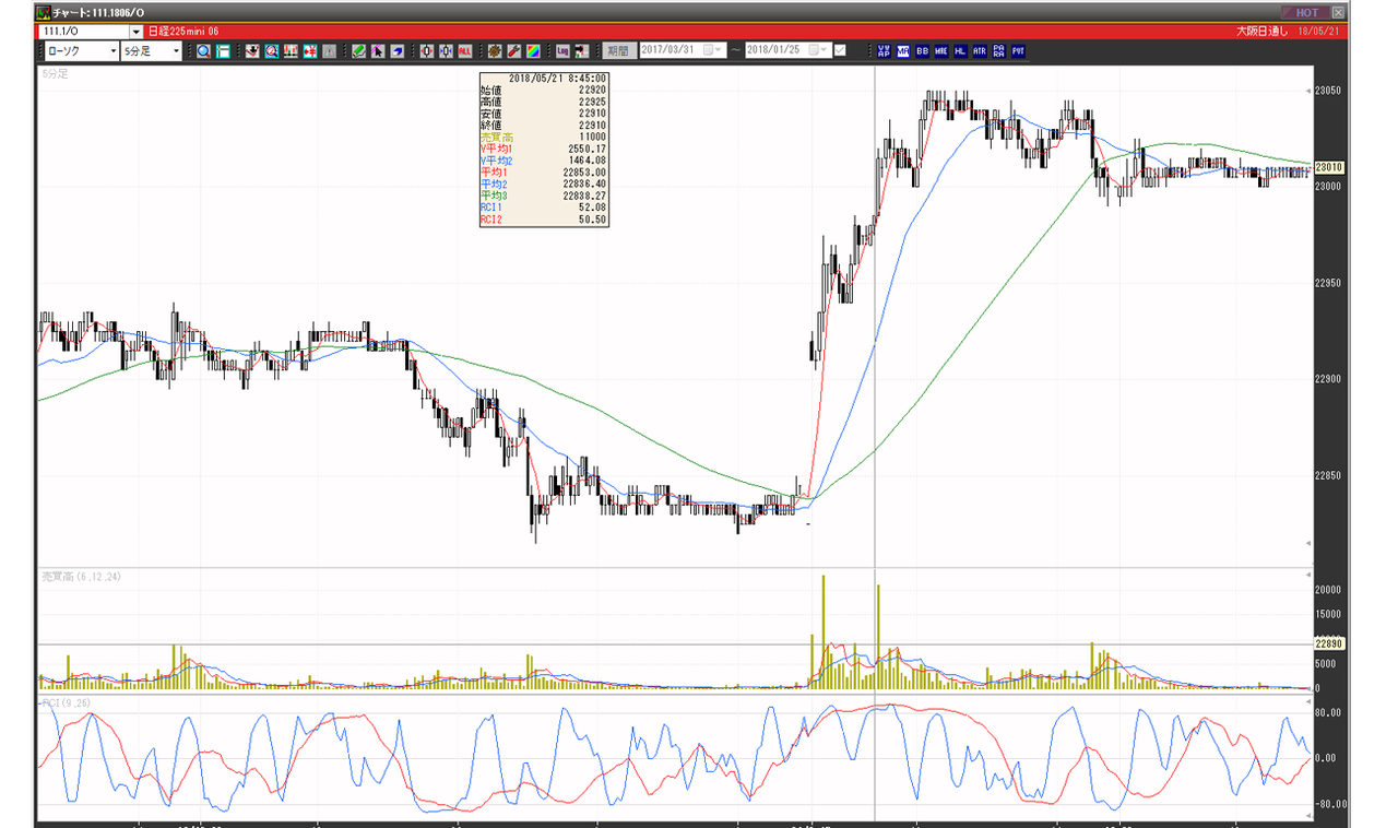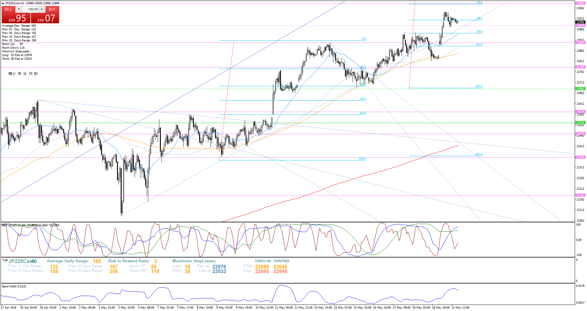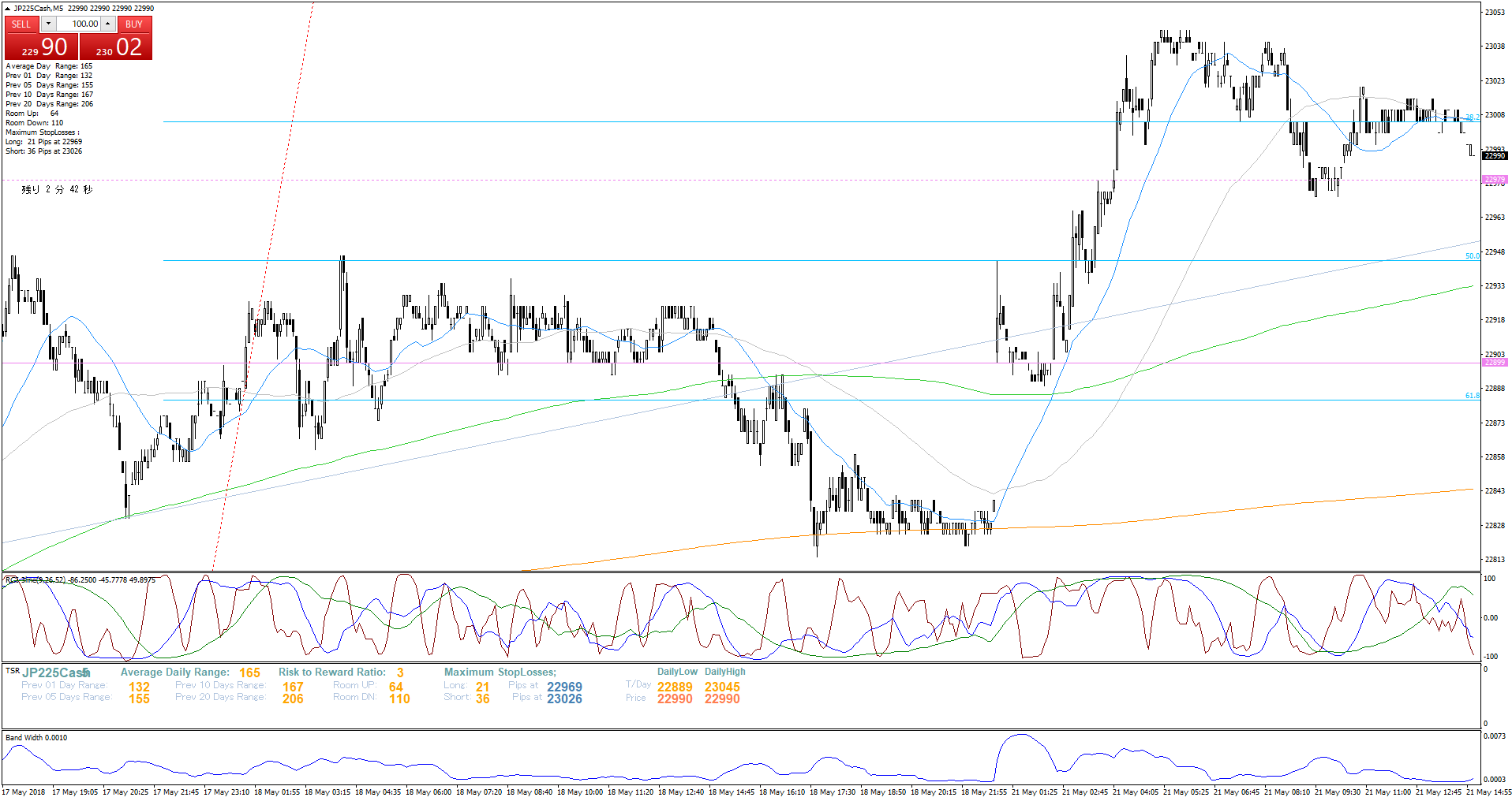 週末に23000円直前で2回頭を抑えられて22815円で金曜日のナイトセッションを終えた。週明けの月曜日、為替がオープニングから強く海外先物と共にGUスタート、日本時間のスタートも70円GU(日通しチャート)スタート。