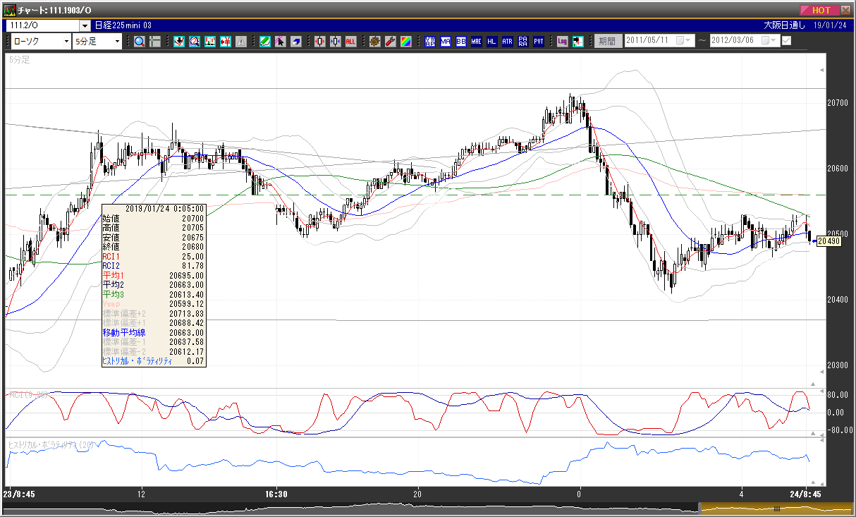 2019/1/23(水)夜間(1/24) 日経225先物/チャート分析/2019年3月限 2019年1月24日 balenouser 未分類 夜間5分足チャート 欧州時間の上げ、NY時間の高値からの売りの典型パターン。高値は昼のセッションの高値を抜いている。 ①欧州時間安値:20495円時間:17:10②欧州時間高値:20695円時間:23:30値幅:200円到達時間:6時間20分—————————-①NY時間高値:20715円時間:23:45②NY時間安値:20410円時間:2:15値幅:305円到達時間:2時間30分