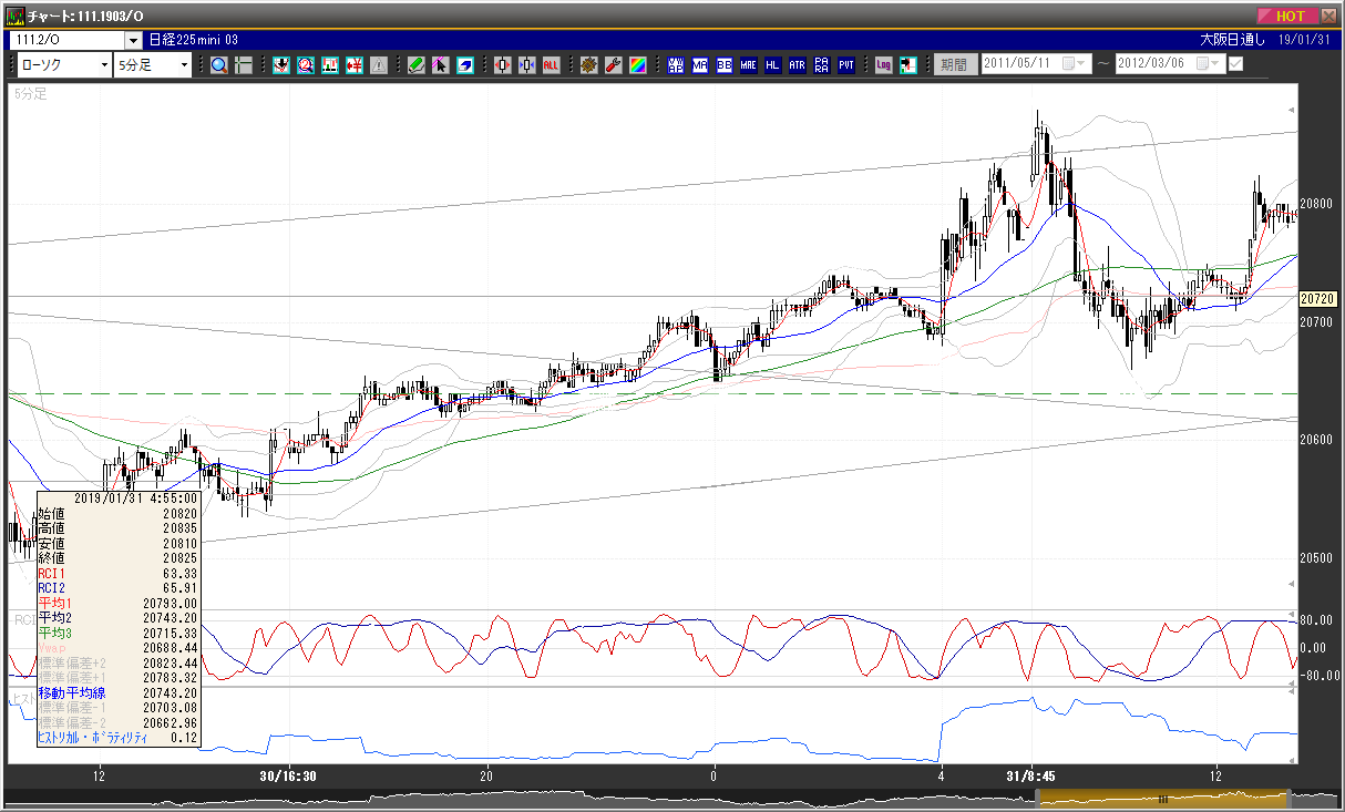 NYオープン後に買いを仕掛けたがやはり発表待ちの側面から動きは鈍い中、板は20750円の蓋へジリジリと向かう。通常であればNY時間で突破する定番の動きになるはずだがやはり発表前までは動きはない。結局高値は翌日、日中セッションの寄り直後になったがトレードの値幅も大したことなく終わった。