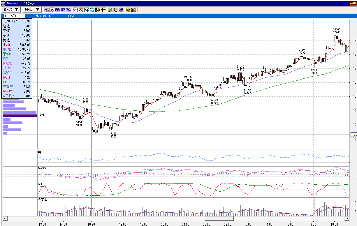 日経225mini 3月限 2016年1月26日 夜間 下げからの大幅上昇