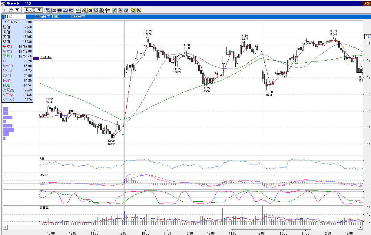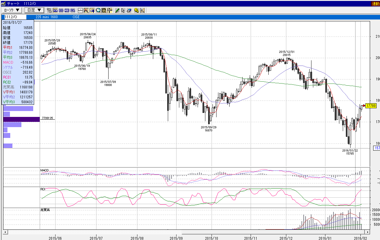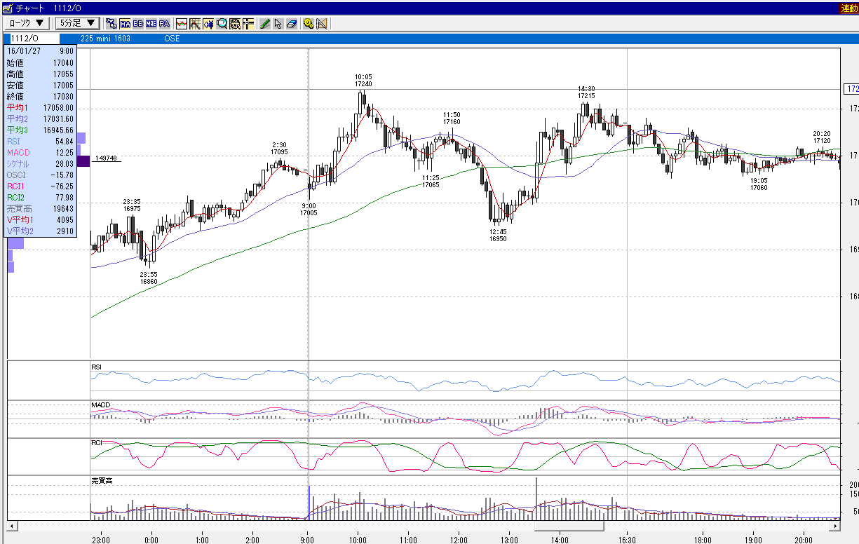 日経225mini 3月限 2016年1月27日 (小幅GD&前場上昇パターン)後場下降