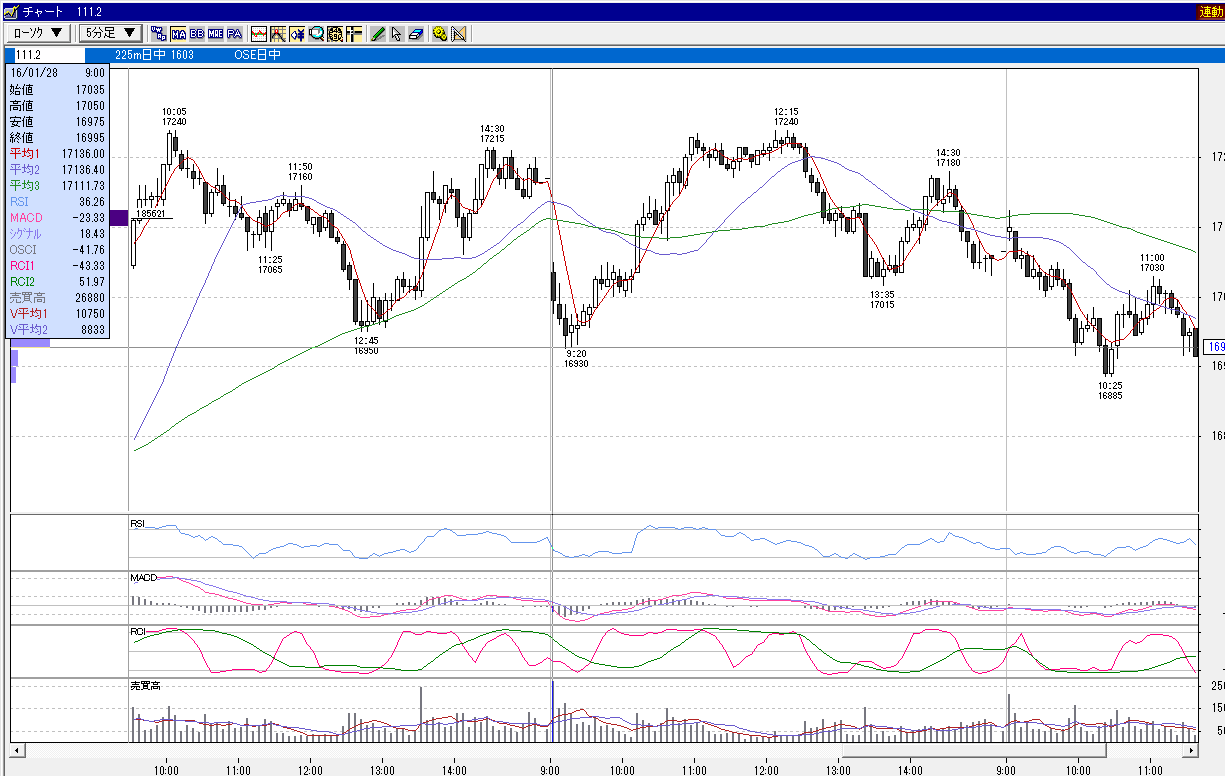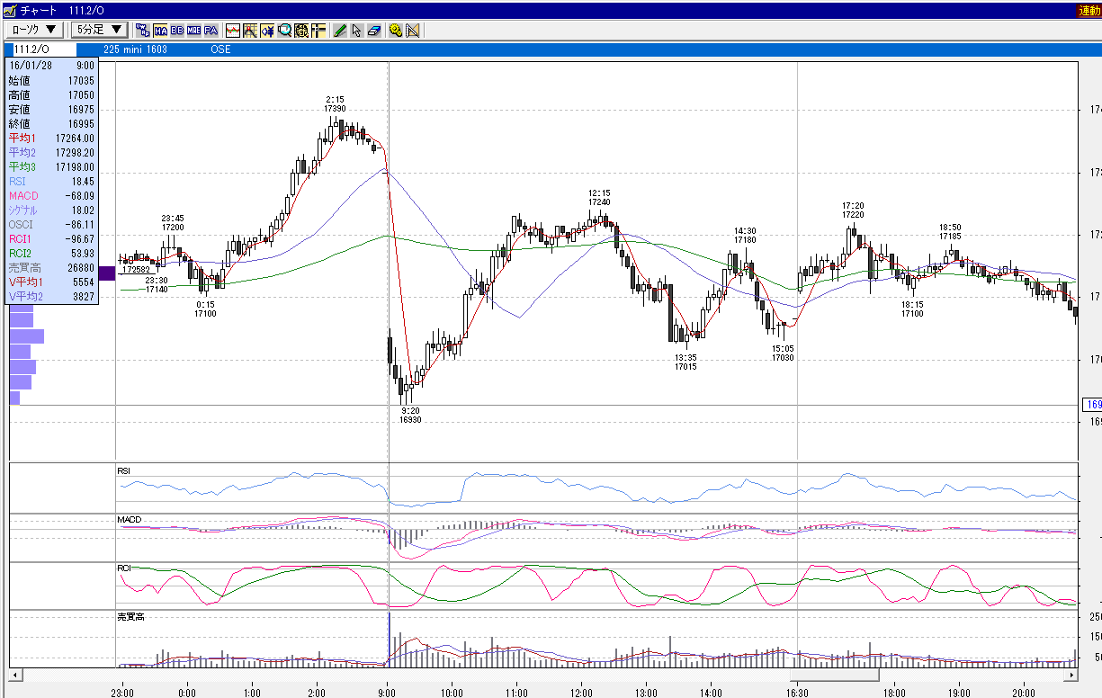 日経225mini 3月限 2016年1月28日 (小幅GD&前場上昇パターン200円前後)後場下降