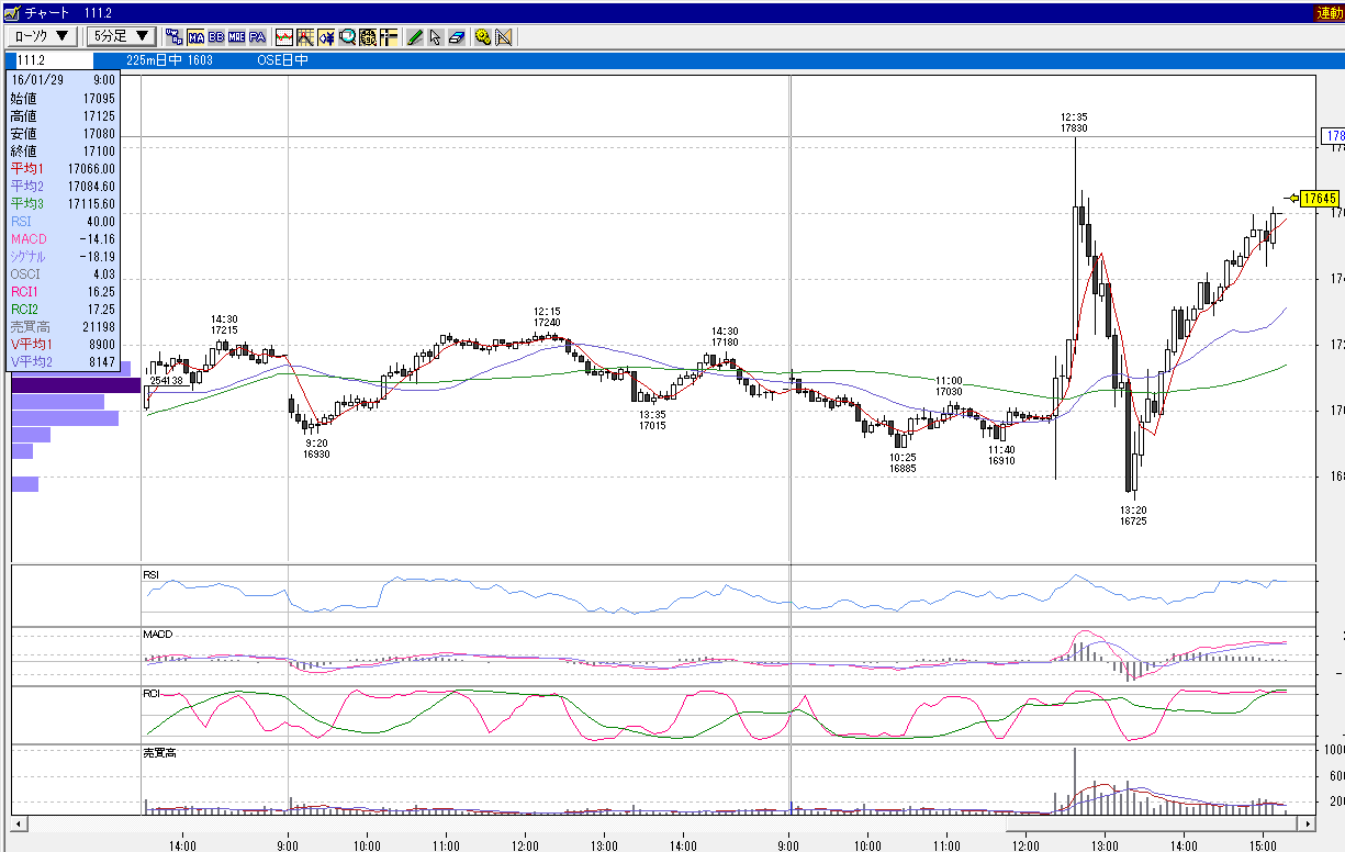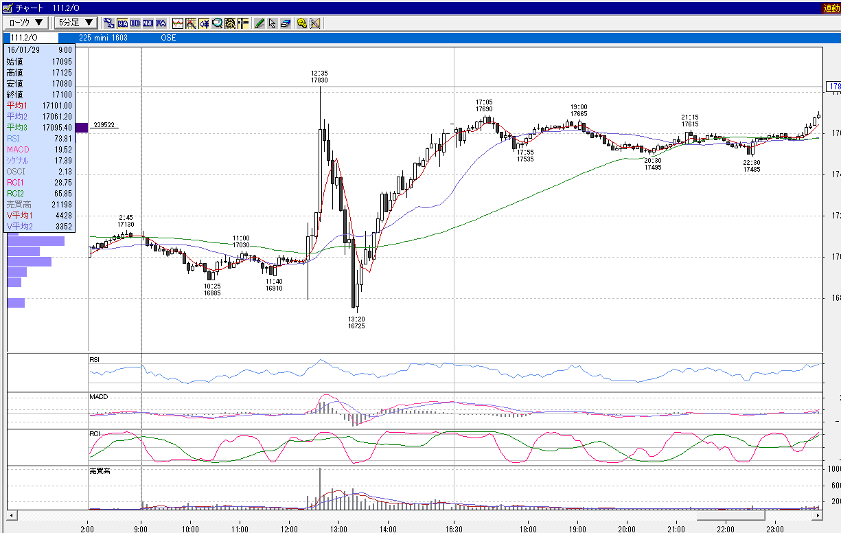 日経225mini 3月限 2016年1月29日 上昇パターン 日銀政策発表 マイナス金利
