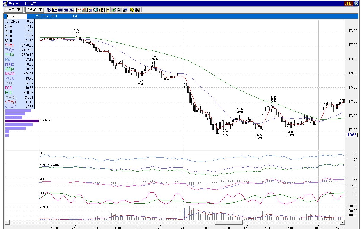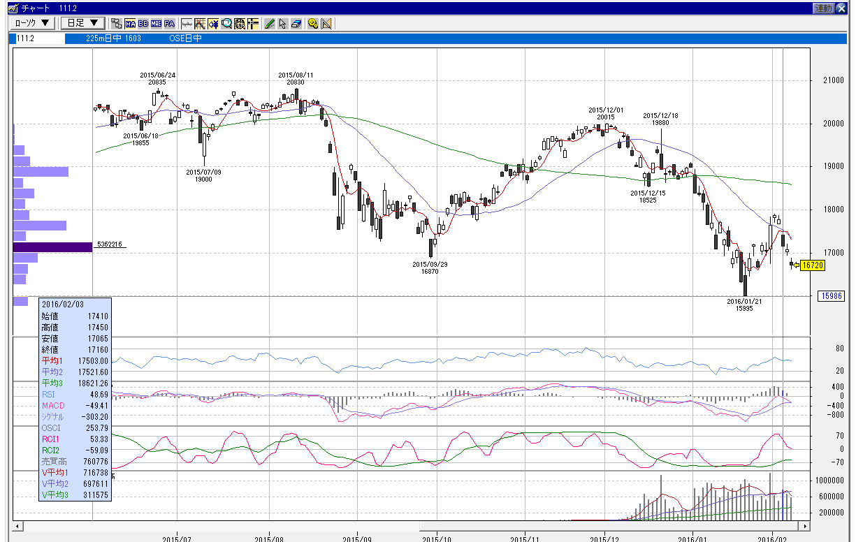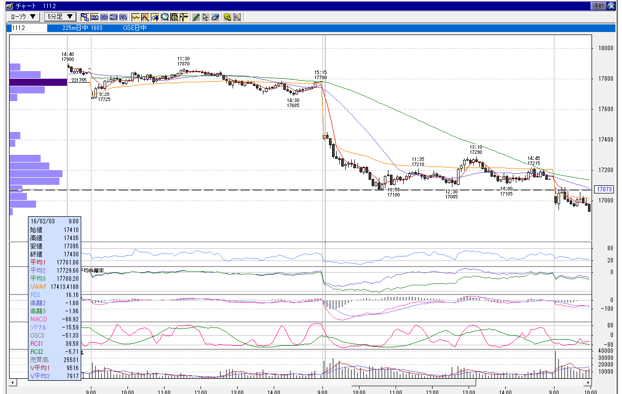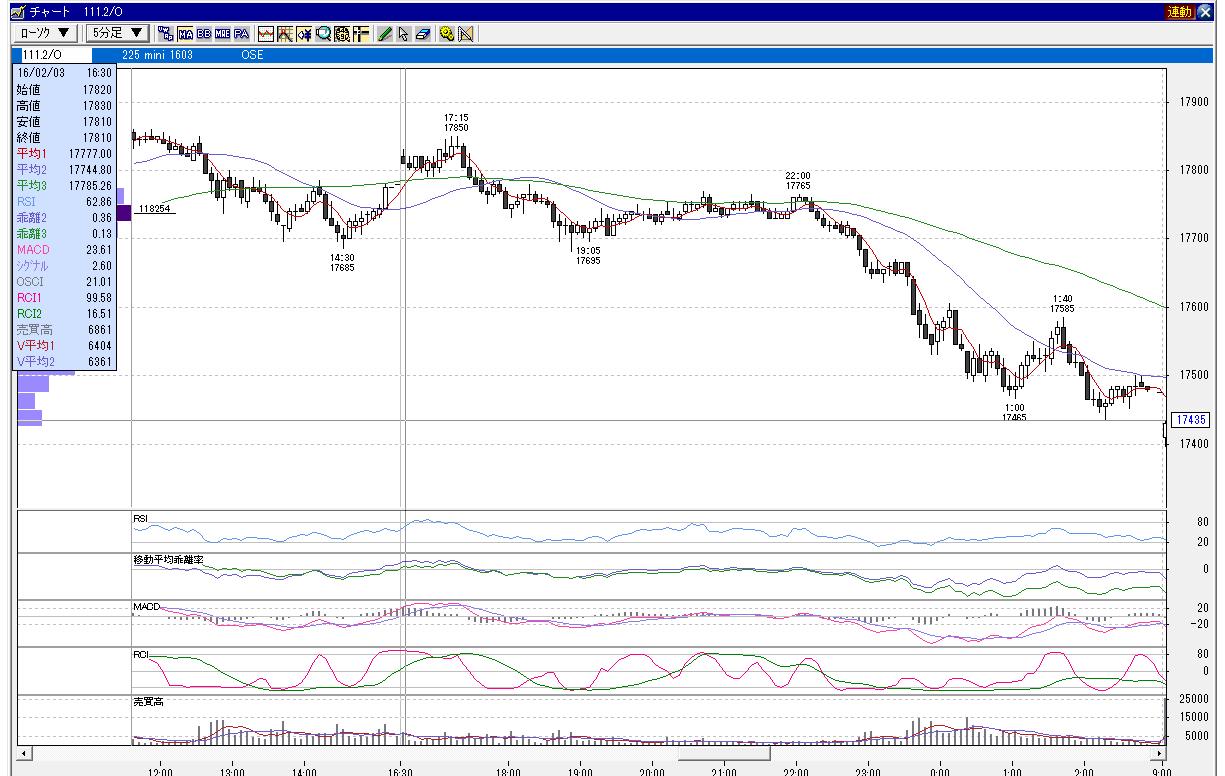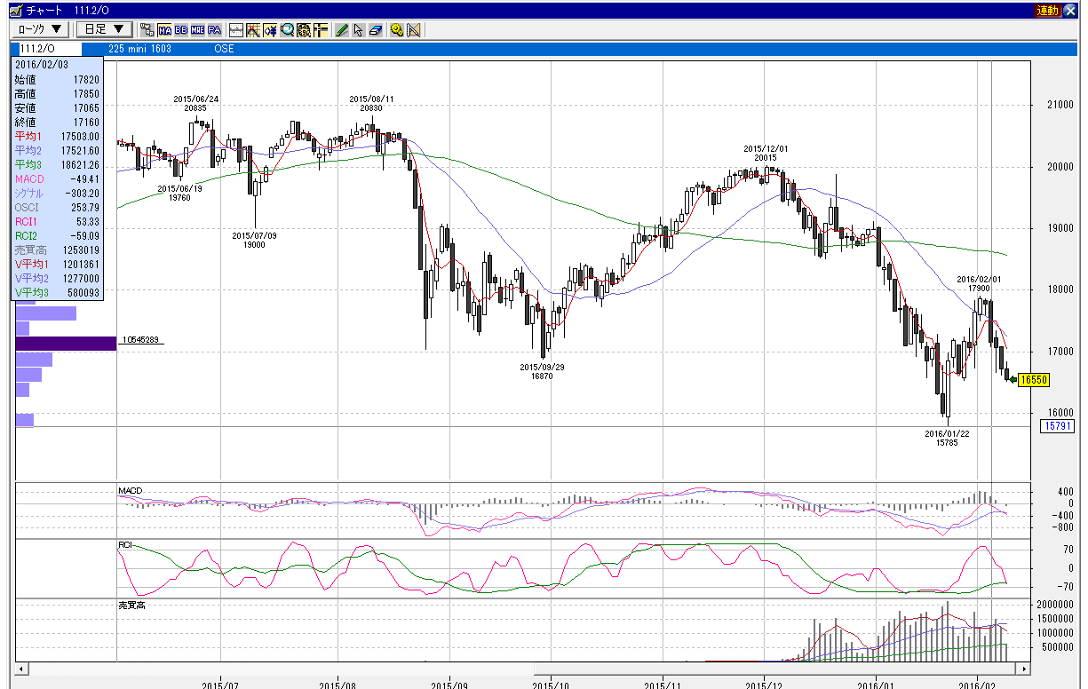 日経225mini 3月限 2016年2月3日 下降相場パターン