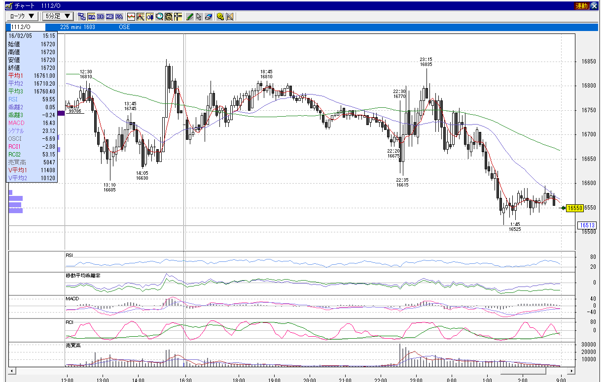 日経225mini 3月限 2016年2月5日 夜間 イベント絡み 米国雇用統計