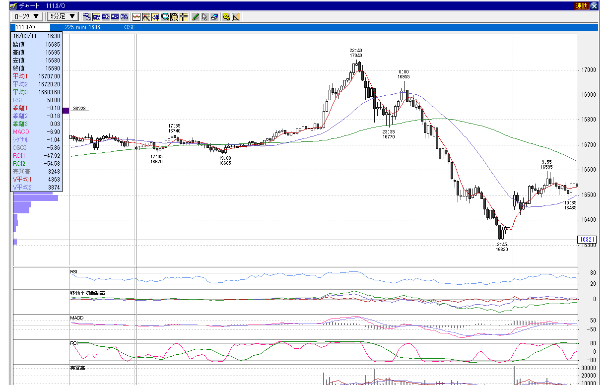 日経225mini 6月限 2016年3月10日 夜間 上昇パターン、SQへ向け叩く ECB金融政策発表 イベント絡み