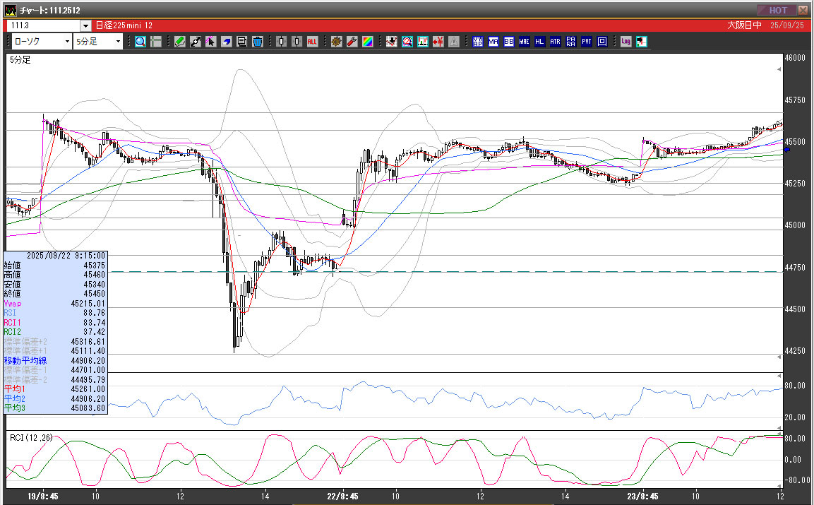 | 2025/09/22 | 12:45 | 45445 | 45510 | 45440 | 45500 | 8111 | 70 | 55 |