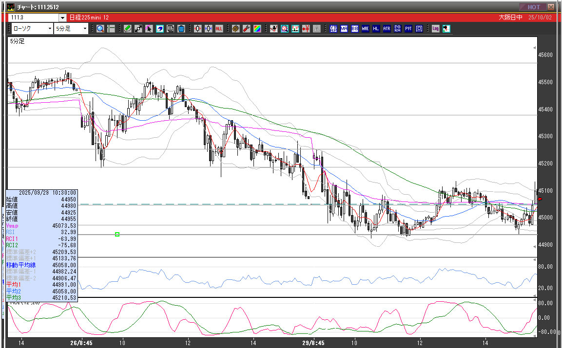 | 2025/09/29 | 10:15 | 45045 | 45070 | 44950 | 44955 | 9531 | 120 | -90 |