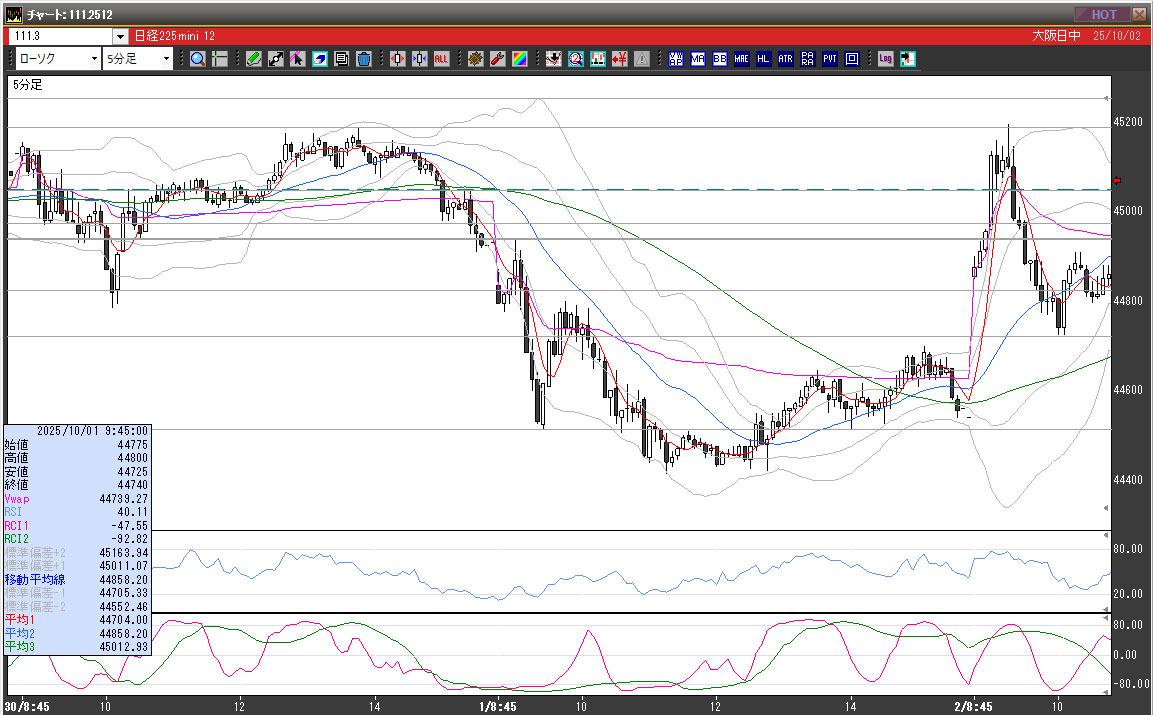 | 2025/10/01 | 9:45 | 44775 | 44800 | 44710 | 44730 | 12363 | 90 | -45 |