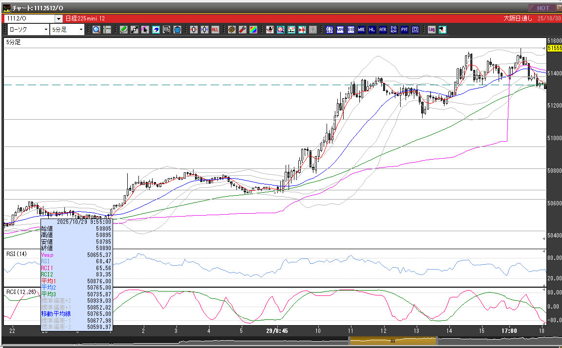 | 2025/10/29 | 9:00 | 50740 | 50840 | 50685 | 50800 | 38119 | 155 | 60 |