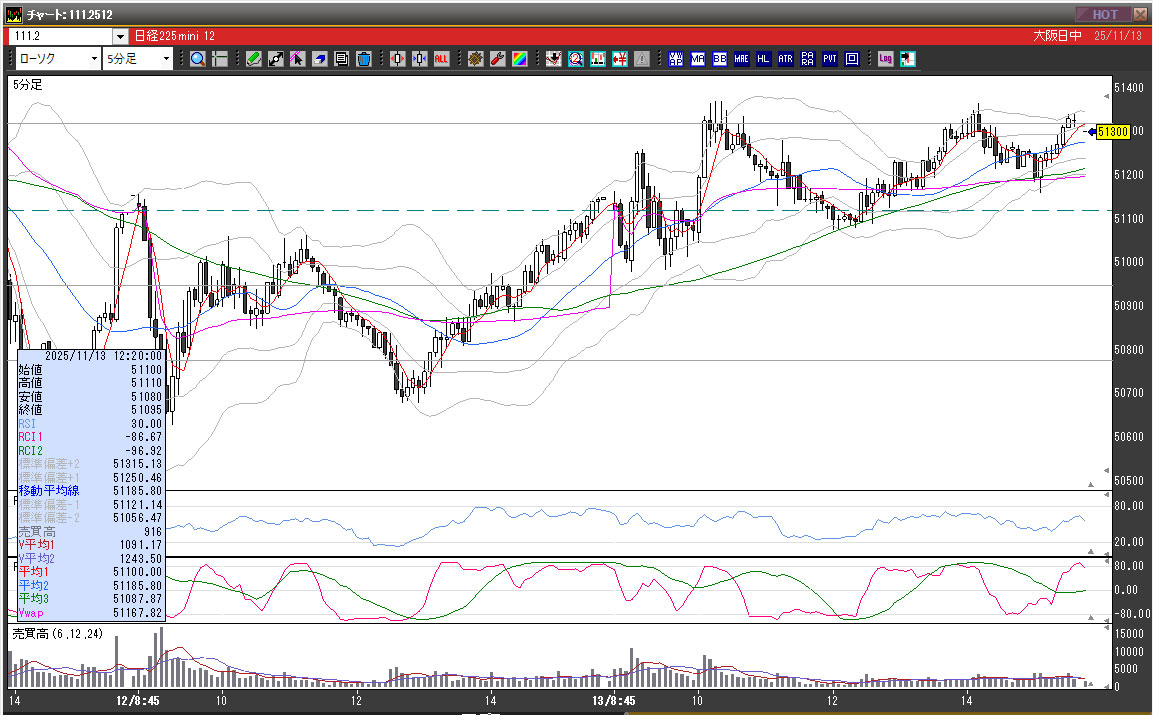 | 2025/11/13 | 11:00 | 51220 | 51240 | 51130 | 51195 | 7773 | 110 | -25 |