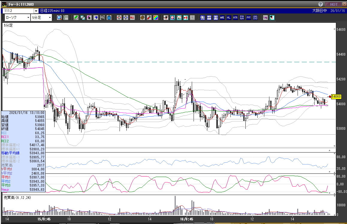| 2026/01/16 | 9:00 | 54110 | 54180 | 53860 | 53995 | 34179 | 320 | -115 |