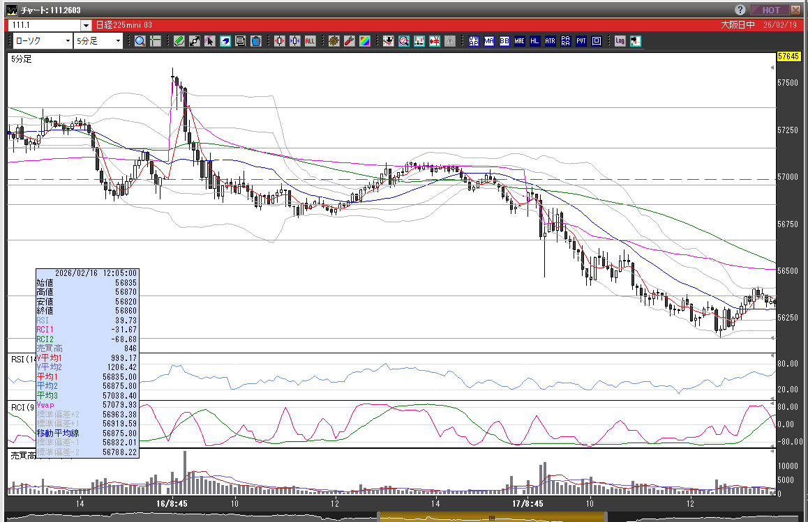 | 2026/02/16 | 11:15 | 56840 | 56890 | 56785 | 56835 | 4129 | 105 | -5 |
