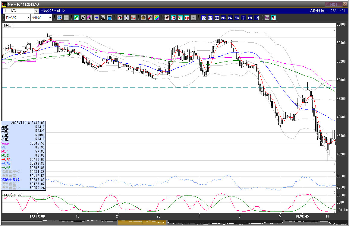 | 2025/11/18 | 3:45 | 50170 | 50220 | 49950 | 49955 | 6246 | 270 | -215 |