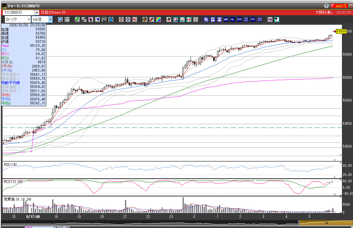このセッションでこれまでの史上最高値の55120円を超えて56000円超えへ、56500円の高値引け。明日の衆院選での高市政権の圧勝を先取りする動きが日中から継続。